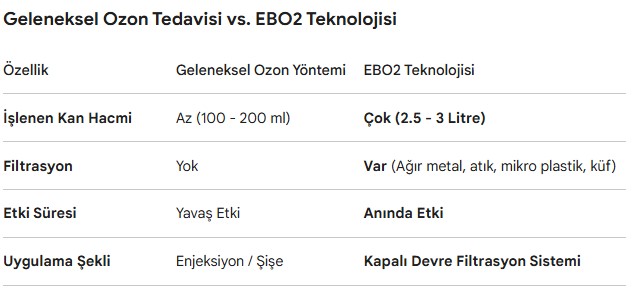Sıradan ozon uygulamalarında (Majör Otohemoterapi) vücuttan sadece 100-200 ml kan alınırken, EBO2 cihazı bir saatlik bir seansta vücuttaki kanın büyük bir kısmını (yaklaşık 2-3 litre) filtreleyebilir. Bu, sistemik bir detoks etkisi yaratır.
